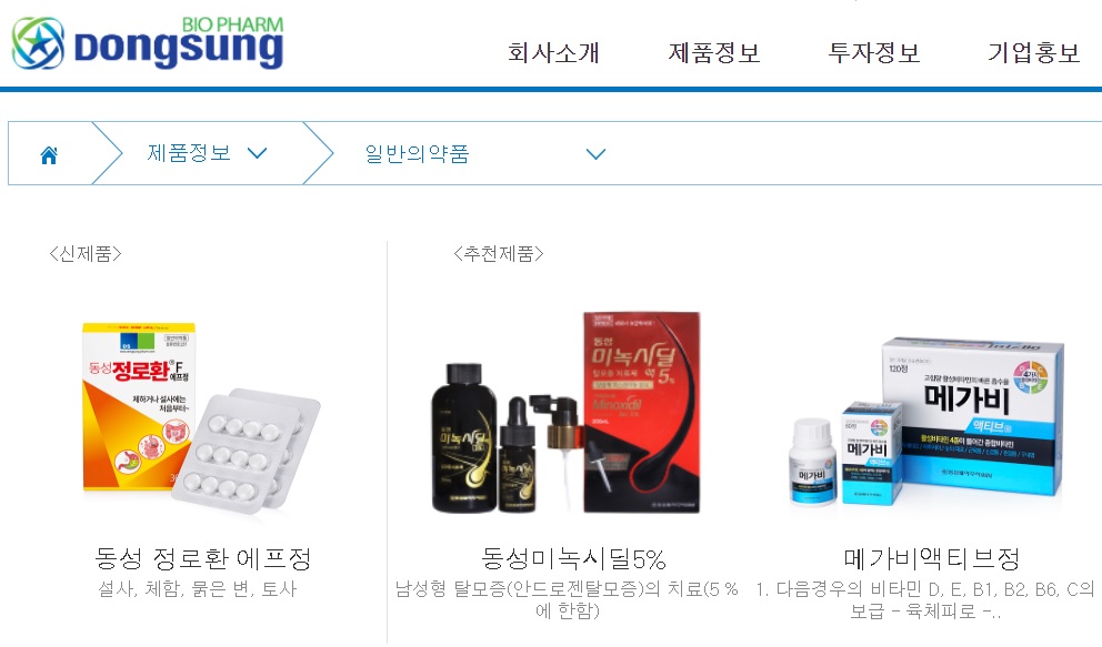 동성제약의 주요 사업 부문은 의약품의 제조 및 판매입니다. 의약품, 화장품, 염모제, 광역학 치료 등의 분야에서 자연 친화적인 제품 개발을 목적으로 하고 있습니다. 주요 제품은 정로환(의약품), 세븐에이트(염모제, 화장품), 동성랑스(화장품), 이지엔(염모제)등이 있습니다.