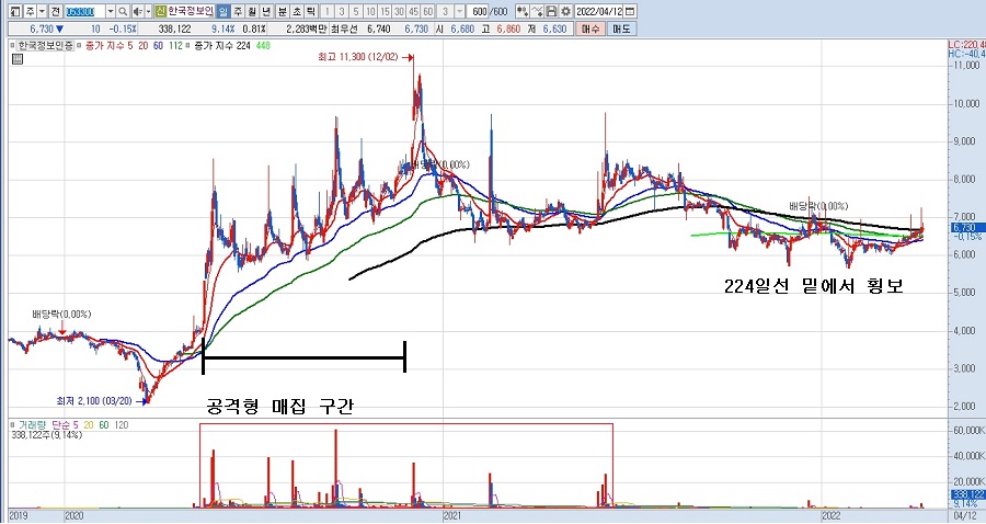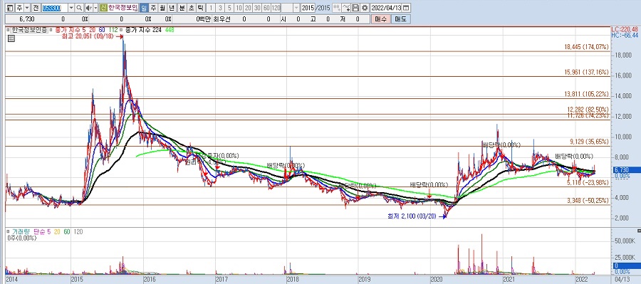 긴 흐름으로 봤을 때, 한국전자인증의 주가의 상승여력은 충분해 보입니다. 장기 투자가 가능한 분은 224일선 아래, 6,500원 이하에서 꾸준히 모아간다면 시세 분출 시 100% 이상 수익을 기대해 볼 수 있습니다.