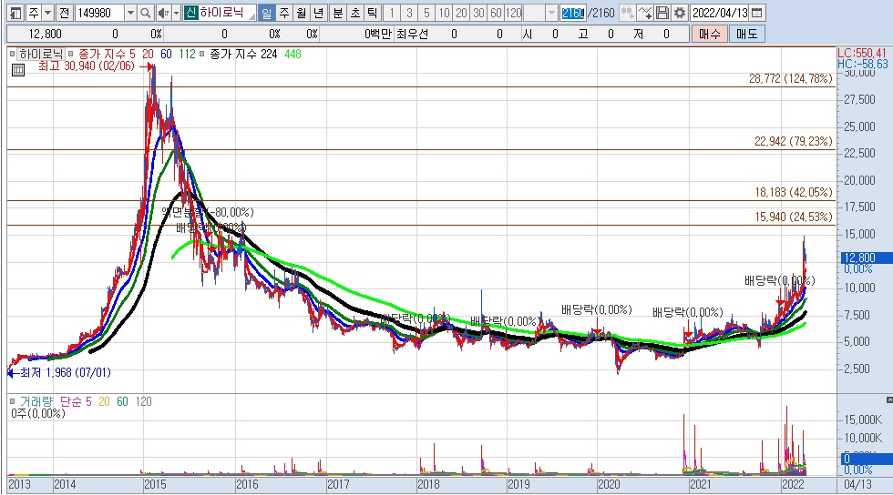 한국정보인증 일봉 차트를 아래 하이로닉 일봉 차트와 비교해 보면 한국정보인증 차트가 조금 더 다이나믹해 보이지만 아주 많이 비슷한 것을 알 수 있습니다.