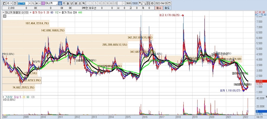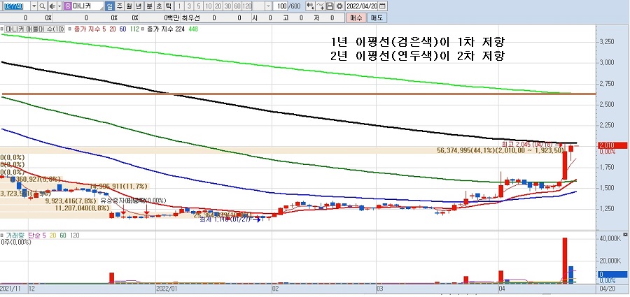 장기 일봉차트에서 보듯이 2016년부터 2018년 까지 역동적인 주가 등락 파동을 보여주다가 2021년에는 주르륵 흘러내려서 현재 주가가 바닥권에 있습니다. 19일 1차 저항대인 1년 장기 이평선에 부딪힌 모습입니다. 마니커 주가전망은 현재 추세라면 1차 저항대는 높은 확률로 뚫을 것으로 보입니다. 한 번에 뚫을지 상한가 장대양봉의 중간값인 1750원이나 장대양봉 시가인 1610원까지 뺐다가 뚫을지는 알 수 없습니다.
