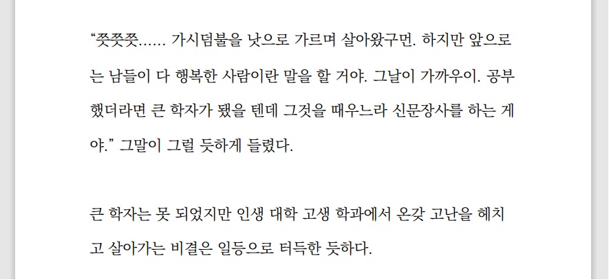 나는 몰래 엄마가 일하는 곳을 찾아가 보았다. 멀찍이서 엄마가 손님에게 물건을 건네주고 돈을 받고 거스름돈을 내어 주는 모습을 지켜봤다. 손님한테 굽신 인사하는 엄마의 모습을 보자 서러움이 복받쳐 왈칵 눈물이 났다. 어머니의 ‘고생’과 우리의 ‘가난’을 피상적인 단어가 아닌 살갗으로 느낀 순간이었다. 화인처럼 뇌리에 선명하게 찍힌 기억이다.