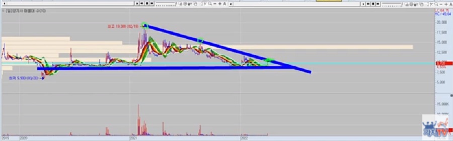 차트상 주가의 저점은 횡보하는데 고점이 점점 낮아지는 경우 삼각수렴 패턴을 이루고 삼각수렴 끝에서는 급락하거나 급등할 확률이 높습니다. 양지사는 급등할 확률이 높다고 보여집니다.
