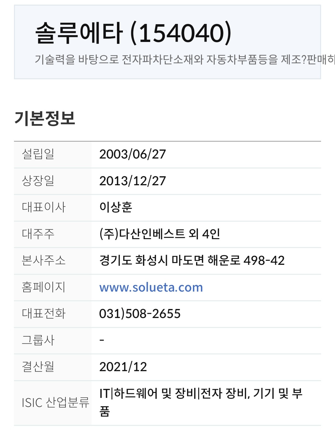 솔루에타는 2003년 설립되었으며 중요 종속회사 2개를 포함해 총 3개의 종속회사를 보유한 중견기업입니다. 자동차부품과 특수 열교환기를 제작 판매하는 사업을 영위하고 있습니다. 전자파차단 소재 부문으로 전도성테이프, 전도성쿠션, 전파흡수체를 생산하여 판매하고 있습니다.