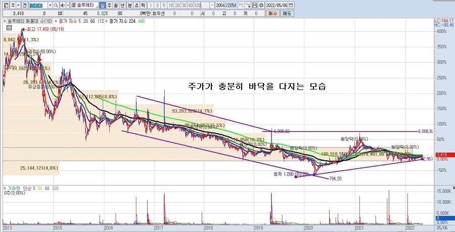 주식단테님이 주린이를 위해 종목을 추천할 때는 충분히 바닥권에 있어서 고가에서 물릴 위험이 없는 자리에 있는 종목을 추천합니다. 솔루에타 일봉차트에서 볼 수 있듯 오랜 기간 바닥권에 있던 종목입니다. 추세선에서 저점이 (2022년 5월 현재까지) 2020년 3월의 저점보다 더 낮아지지 않았습니다.
