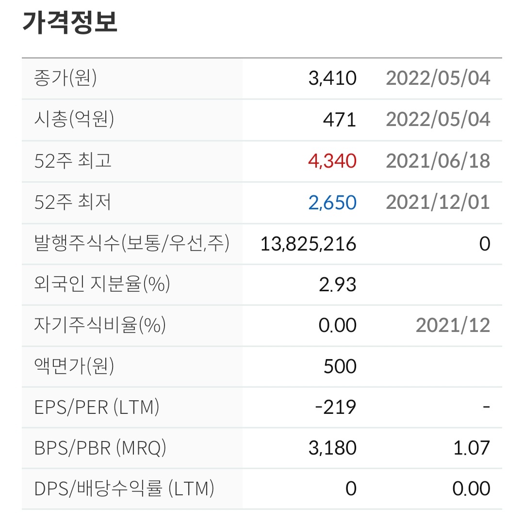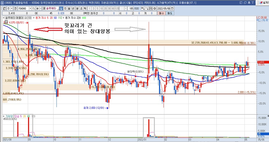 2021년 9월과 2022년 1월에 대량 거래를 동반한 윗꼬리가 긴 장대양봉이 보입니다. 빅머니의 흔적이라고 볼 수 있습니다. 5월 4일 현재 주가가 1년 이평선을 올라탔습니다. 1년 이평선을 지지 삼아 주가 상승을 예측해 볼 수 있는 자리입니다.