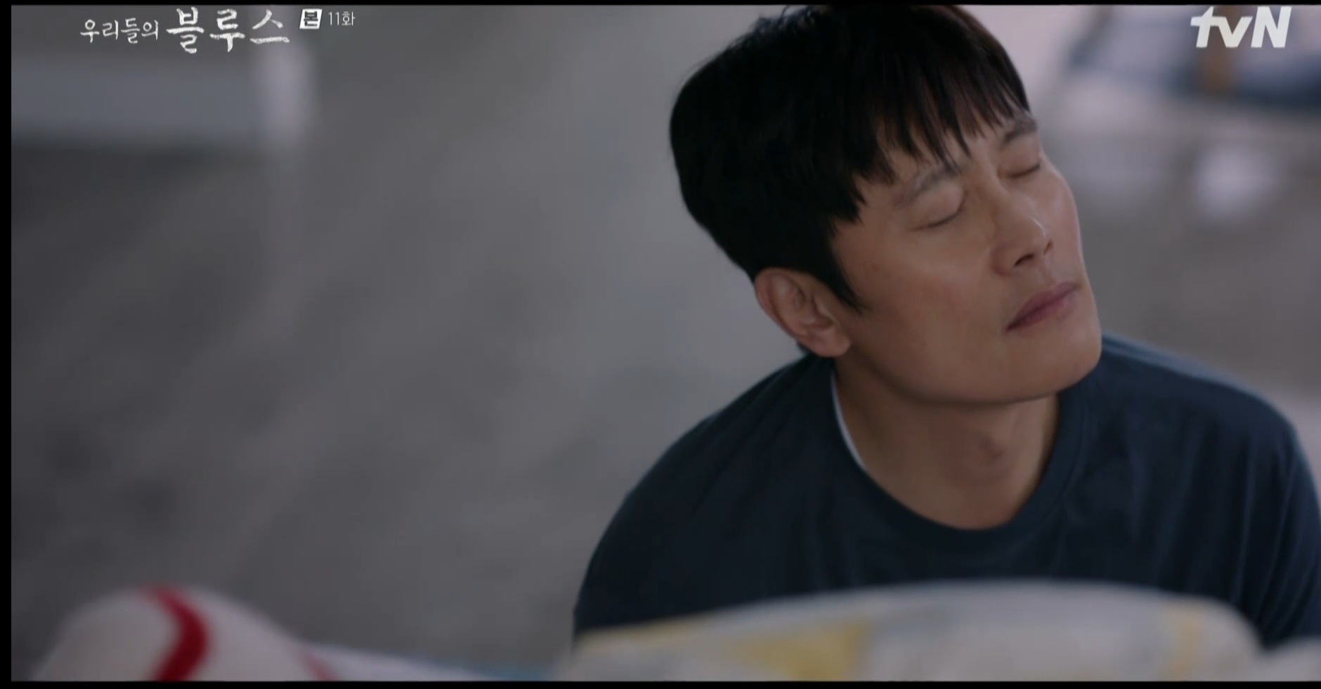 우리들의 블루스 11회 줄거리에서 가장 압권은 선아가 우울증상을 극복하는 장면입니다. 동석이 거실로 옮겨 준 침대 위에 앉아 있으니 창 밖 불빛이 하나 둘 점멸되고 사위는 어둠뿐입니다. ‘이건 가짜다 착각이다’ 되뇌이고 스마트폰으로 동석이 말 타며 웃는 영상을 봅니다. 어떻게든 움직이라는 동석의 말대로 러닝머신에 올라섭니다. 마침 동석이 선물이라며 녹음 파일을 보내줍니다. “양은 냄비, 고무 다라이, 아랫도리, 윗도리...” 선아의 얼굴이 미소가 어리고 창 밖 불빛이 하나 둘 점등됩니다.