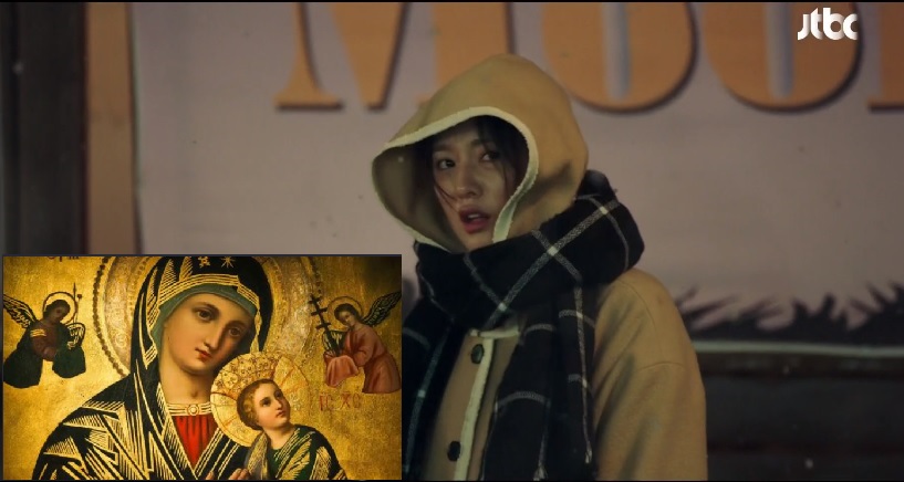 미정과 구씨가 처음으로 만난 날 미정의 의상입니다. 드라마를 분석하는 리뷰어는 미정의 의상이 성모 마리아를 연상시킨다며 미정이 구씨를 어둠의 세계에서 구원하고 카르마의 굴레에서 해방시킨다고 해석하기도 하죠.