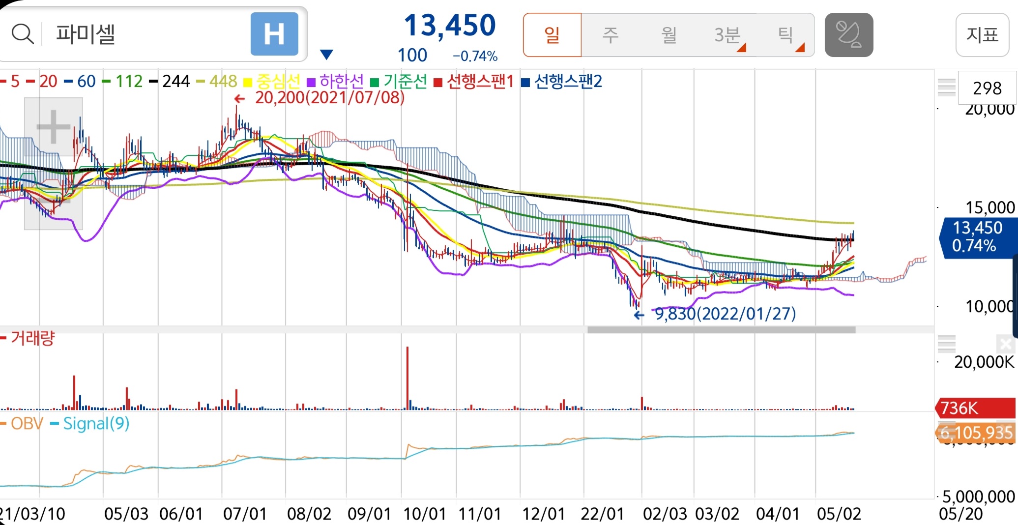 파미셀 일봉 차트를 보면 9개월 이상 1년 장기 이평선 밑에 있던 주가가 이제 막 1년 이평선을 뚫은 모습입니다. 원숭이 두창 관련주가 아니였어도 주가 슈팅이 나올 수 있는 자리였네요.