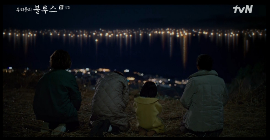 우리들의 블루스 17화 줄거리에 이렇게 아픈 스토리만 있었던 건 아닙니다. 며느리로부터 만수의 임종을 준비하라는 의사의 말을 전해 들은 춘희 할망. 푸릉 사람들은 춘희 할망과 은기의 아픔을 달래주고 만수의 회복을 기원하기 위해 연대합니다. 은기는 아빠 만수가 달 100개에 소원을 빌면 이뤄진다고 말했고 그것을 믿고 있습니다. 달 100개를 만들기 위해 푸릉 사람들은 모두 배를 띄워 집어등을 밝힙니다.