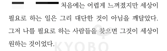 ‘더 성장하고 싶었기 때문에 집에 돌아가서도 내가 맡은 업무와 관련한 공부를 하거나 리서치를 했다. 그러자 놀랍게도, 넷플릭스를 보거나 게임을 하며 억지로 워라밸을 지키겠다고 애썼을 때보다 훨씬 더 삶이 즐거워졌다. 그리고 결국 워라밸에 집착하지 않고 내가 하고 싶은 일에 몰두했던 당시의 시간이 쌓이고 쌓여 이제는 나를 월급의 노예로 살던 삶에서 완전히 해방시켜줬다.’ 성공한 분들이 공통적으로 하는 말을 저자도 하고 있습니다. ‘워라밸을 지키면서 성공을 바라는 건 욕심일지 모른다.’
