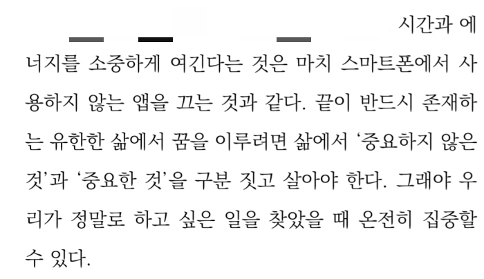 ‘만약 아이폰 배터리를 영영 충전하지 못한다면 어떻게 될까? 그리고 그 사실을 내가 알고 있다면 어떨까? (중략) 시간과 에너지를 소중하게 여긴다는 것은 마치 스마트폰에서 사용하지 않는 앱을 끄는 것과 같다.’