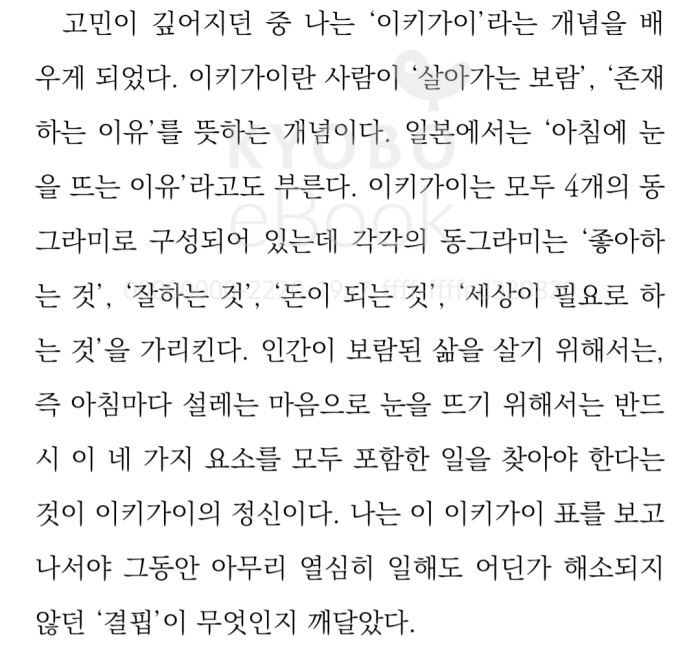 ‘회사에서 보내는 시간이 마치 내 삶을 희생하는 시간처럼 느껴지기 시작한 것이다. 일하는 시간은 무조건 나쁜 것이고 집에서 쉬는 시간만이 좋은 것이라는 강박관념이 나를 사로잡았다.’