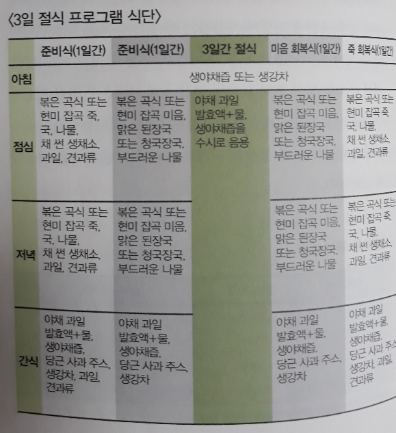 절식이란 식사를 잠시 중단하고 생야채즙, 야채과일 발효액, 생강차나 감잎차, 죽염, 더운물만 섭취하는 방법이다.