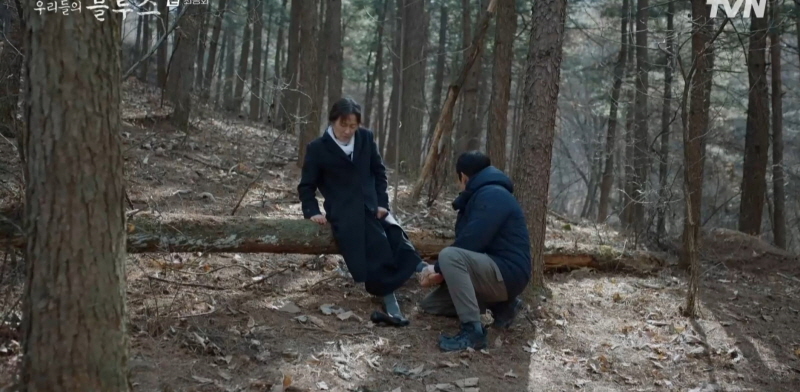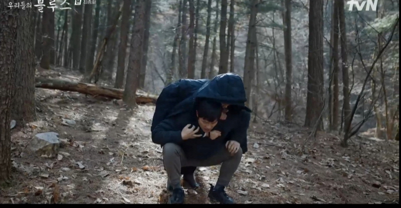왔던 길로 돌아가는 길, 동석은 옥동이 절뚝거리는 걸 알아차리고 아픈 발목을 확인합니다. 그리고 옥동을 들쳐 업습니다.