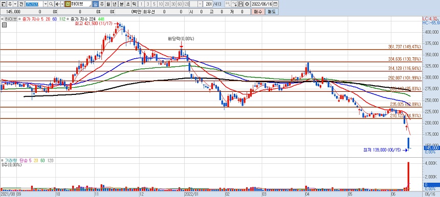 하이브 주가는 국내 거의 모든 종목처럼 미국 물가 쇼크로 이미 급락한 상태였습니다. 개별 종목은 시장을 거스르기 힘듭니다. 지금은 개별 종목들이 이슈와 재료에 따라 등락이 거듭되는 혼조 장세입니다. 하이브 주가는 작년 11월17일 최고점 42만1500원을 기록했고 15일에는 최고점 대비 67% 하락한 가격으로 장을 마감했습니다.