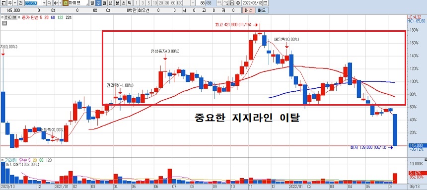하이브 주가를 주봉차트로 보면 박스 안 주가 흐름이 전형적인 헤드 앤 숄더 패턴임을 알 수 있습니다. 중요한 지지라인을 이탈하고 어제 급락해서 145,000원에 거래를 마감했습니다.