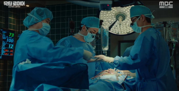 수술실. 닥터로이어 8회에서 손을 다친 한이한의 손이 떨리자 최요섭이 대신 집도하겠다고 나서고 한이한이 어시스트하게 됩니다. 다행히 수술은 성공했습니다.