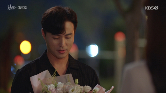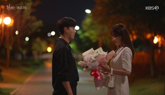 윤재는 해준이 야근한다는 사실을 알고 로펌에서 프러포즈하려고 합니다. 꽃다발을 준비해서 늦은 시각 로펌으로 찾아갔으나 보는 눈이 많아서 장소를 옮깁니다.