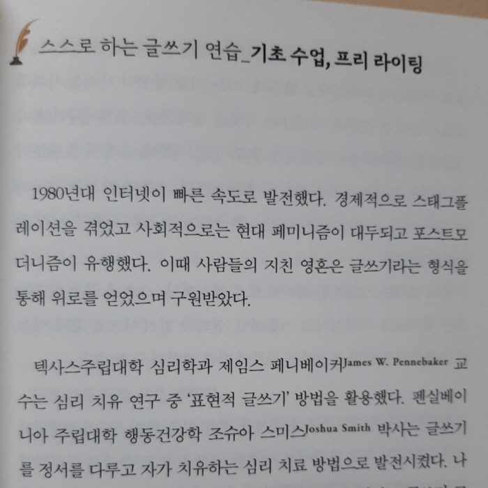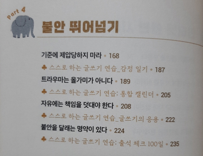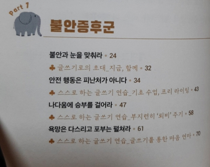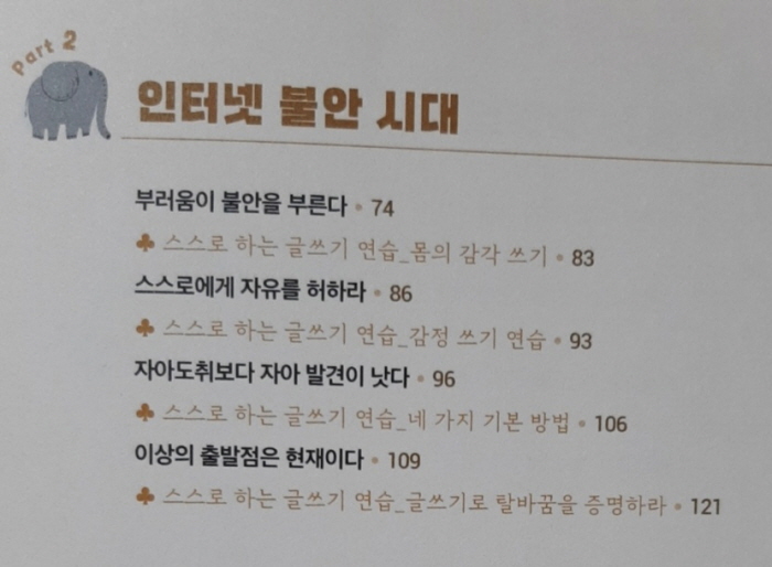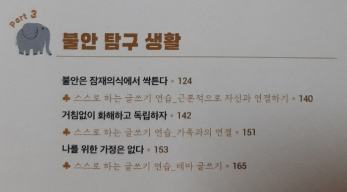 저자가 불안과 걱정을 털어내기 위해 강력하게 추천하는 것이 글쓰기입니다. 소제목이 끝날 때마다 스스로 글쓰기 하는 방법을 알려주고 있습니다. 글쓰기가 낯선 이들을 위해 ‘글쓰기로의 초대’부터 시작해서 ‘글쓰기의 응용 – 자체 창작’ 단계까지 친절하게 안내합니다.