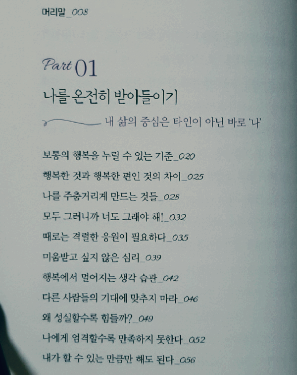 저자는 현대인들이 열심히 일하고 즐기는 듯 해도 행복감을 느끼지 못하고 쉽게 지치는 것은 바로 끊임없는 비교와 지나치게 높은 기준 때문이라고 간파합니다. SNS의 발달로 나의 하이라이트를 편집해 보여주고 타인의 편집된 하이라이트를 구경하며 끊임없이 비교합니다. 이제 비교를 멈추고 조금 부족해도 있는 그대로의 나를 받아들여야 합니다. 견고한 자기 인식(self awareness)의 토대 위에 저자가 알려주는 대로 충만한 행복을 느끼는 방법을 시도해봅니다.