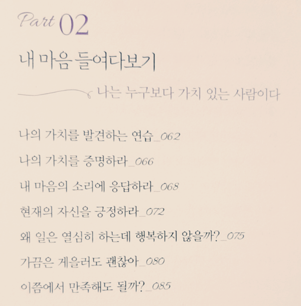 ‘자신의 매력과 장점을 찾는 과정 자체가 무가치감을 치유하는 시간이 됩니다. 그러므로 가능한 시간을 많이 들여 이 과제를 수행해보세요. 이것이 제가 학생들에게 100개 혹은 300개라는 숫자를 제시하는 이유입니다. ‘나의 매력은 무엇일까?’라고 생각해보는 시간이 길어질수록 이런 생각이 습관처럼 익숙해집니다.’