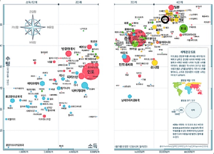 책 표지 안쪽에 세계 건강 도표는 저자, 저자의 아들, 며느리가 세계 각국의 소득수준과 평균수명(건강함) 데이타를 보기 좋고 이해하기 쉽게 도표로 나타낸 것이다. 그들의 아이디어에 감탄하고 한국의 높은 위치에 크게 감탄했다.
