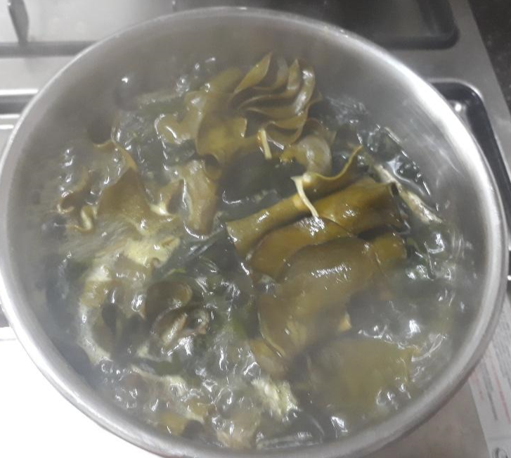 육수에 미역과 미역귀를 넣고 끊인다.