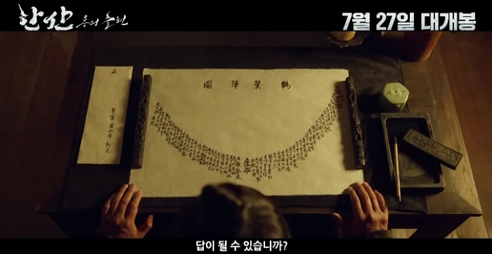 이순신 장군의 치밀한 지략가의 면모를 마음껏 표현했습니다. 한산에서의 결전을 앞두고 백지 앞에 정좌한 이순신 장군을 보면서 인간 이순신이 짊어진 국운의 무게를 헤아려 보게 되더군요. 백지 위에 학익진도(圖)를 그리며 장수들의 성격에 따른 학익진 배치 위치와 이름을 일일이 써내려가는 장면은 뭉클한 감동을 안겨주었습니다.