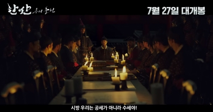 제 앞에 있던 관객은 제 시야를 방해하는 기지개를 쭈욱 켜더니 잠깐이지만 스마트폰을 켜서 빛을 사방에 뿜는 무례를 범하더군요. 지루했다는 뜻이죠. 포스팅 서두에 밝혔듯 ‘한산에는 (인물들의 서사에 대한) 압도적 디테일이 필요하다’입니다. 많은 경우 관객이 인물의 서사에 빨려들면서 영화의 재미가 배가 되니까요.