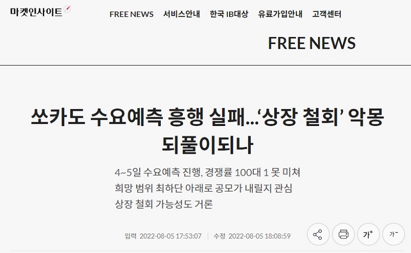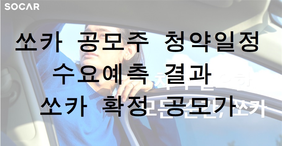 8월 5일 금요일 오후 6시 35분 현재 투자은행(IB)업계에 따르면 쏘카는 지난 4일과 5일 진행된 쏘카 공모주 청약 기관 수요예측에서 최종 경쟁률은 100대 1에 미치지 못한 것으로 알려졌습니다. 또 수요 대부분이 공모 희망가격 밴드인 3만4000~4만5000원의 하단이나 이에 못 미치는 가격을 써내 공모 희망가 밴드 내의 가격으로 공모를 진행하기는 어려워보입니다. 업계에서는 청약 철회 가능성도 있다고 보고 있습니다. 자세한 사항이 나오면 본 포스팅을 계속 업데이트하겠습니다.